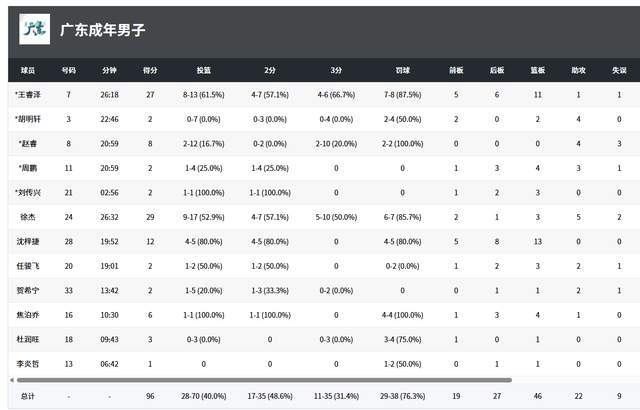 从数据来看,广东队3人得分上双,徐杰爆发,独砍29分5助攻,王睿泽27分11篮板,赵睿12投2中,只拿到8分4助攻2抢断,沈梓捷12分13篮板。胡明轩7投0中,靠4罚2中拿到2分1篮板4助攻。