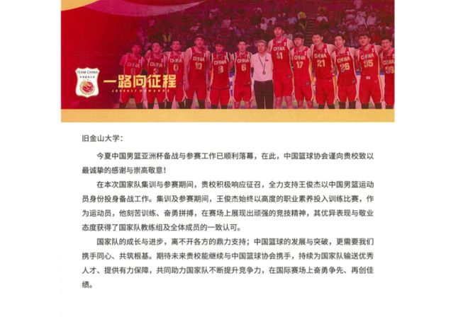 不用担心王俊杰有NCAA比赛任务无法回国参赛,因为篮协早已布局好了——亚洲杯结束后,篮协曾给旧金山大学送上感谢信,为球员参赛协调打下基础。