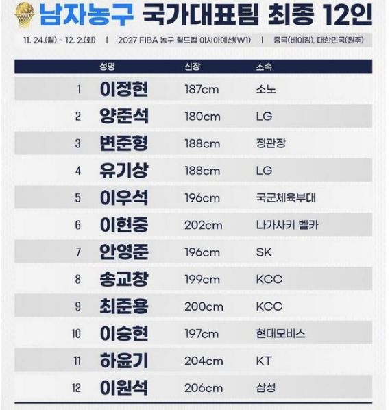 目前,韩国男篮世预赛12人名单已被曝出,详细人员分布如下: